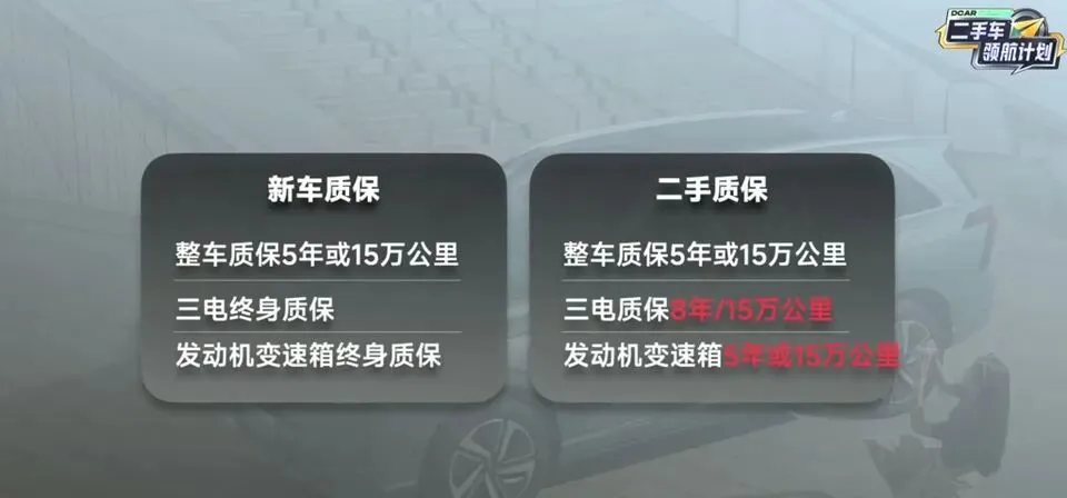 新车整车质保5年或15万公里,二手也不变,继续享有剩余质保。但关键来了——新车首任车主的三电系统、变速箱、发动机终身免费保修,到了二手就变成了8年或15万公里,发动机和变速箱的终身保修直接没了,按整车5年或15万公里来算。