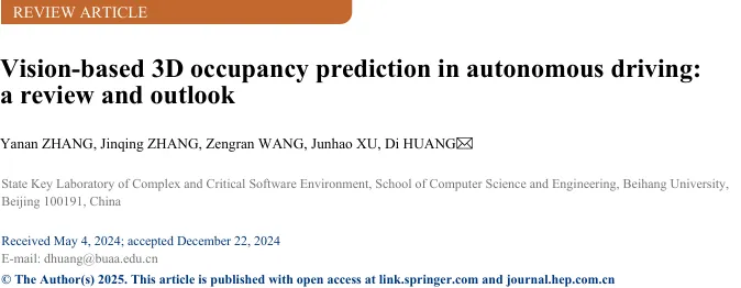 Yanan ZHANG, Jinqing ZHANG, Zengran WANG, Junhao XU, Di HUANG. Vision-based 3D occupancy prediction in autonomous driving: a review and outlook. Front. Comput. Sci., 2026, 20(1): 2001301 DOI:10.1007/s11704-024-40443-5阅读原文: