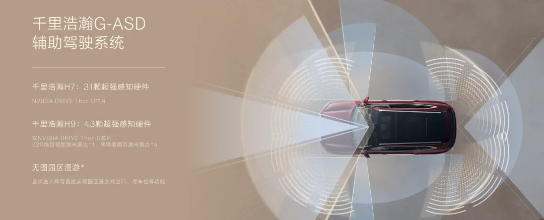 硬件拉满:配备5颗激光雷达、43颗感知硬件,搭配双NVIDIA Thor-U智驾芯片,总算力高达1400TOPS,算力较行业顶级双Orin-X芯片提升175%,360°全方位覆盖路况,无死角捕捉路面车辆、行人、交通标识,甚至能感知救护车声音、交警手势。