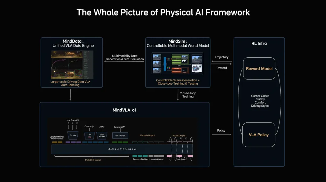 MindVLA-o1是理想汽车面向物理世界智能核心AI框架的重要组成部分。这套AI框架由四大核心模块组成:MindData,统一的VLA数据引擎,负责大规模数据的采集、清洗和自动标注;MindVLA-o1,统一的原生多模态VLA模型,可以理解环境、进行推理,并生成驾驶行为;MindSim,可控的多模态世界模型,用于生成复杂驾驶场景并支持大规模闭环训练;RL Infra(强化学习基础设施),通过奖励模型和策略学习,使系统在仿真与真实环境中自我进化。
