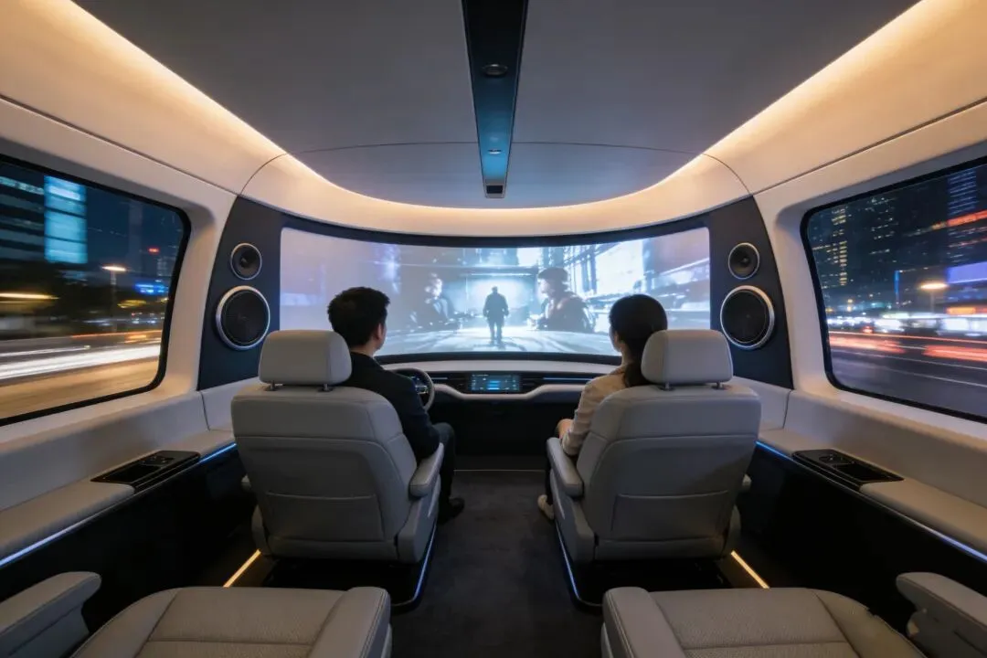 它最大的意义,是解放车内空间,让汽车成为家、办公室之外的“第三空间”,可以是移动办公室、移动休闲室、移动影院。