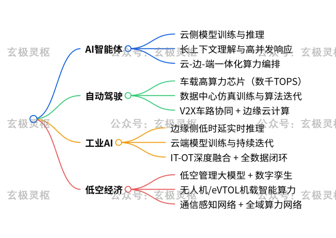 AI 智能体、自动驾驶、工业 AI、低空经济本质上都在把自己变成“跑在芯片和集群上的系统”,算力是它们共同的“水电煤”。算力已经不是“要不要跟这四个赛道绑定”的问题,而是“怎么绑定”的问题:一、整体框架:四大赛道如何绑定算力