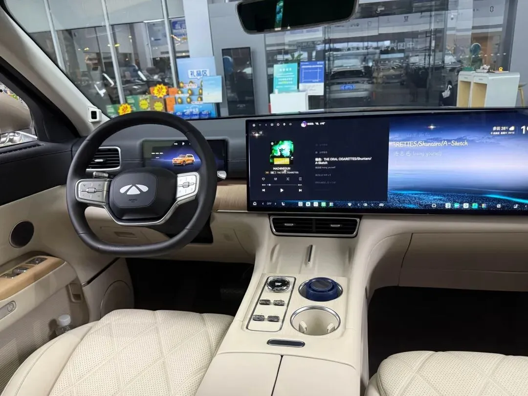 内饰第一感觉.是屏.幕很夸张,30英寸6K贯穿大屏,一整块.铺开。你坐进.去真的有点.像三十万级.别的车。用手摸一.下中控台,上面.是软包,缝线也.还行,我用指甲敲一下,没.有那种空空的“咚咚”声,这点我要给好评。