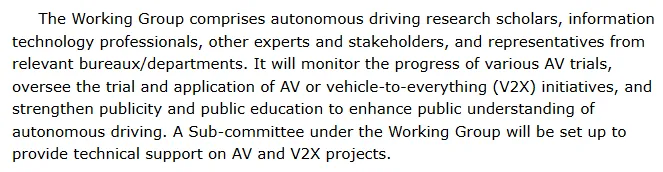 新闻稿中提到,香港自动驾驶应用推广工作组的成员包括自动驾驶研究学者、IT专业技术人员及其他专家和相关方,以及相关司局/部门的代表。工作组将监察各项自动驾驶车辆试验进展,督导自动驾驶和V2X的试验及应用,并加强宣传及公众教育,以提升公众对于自动驾驶的认知。工作组将下设小组委员会,为自动驾驶及V2X项目提供技术支持。新闻稿原文如下图所示。