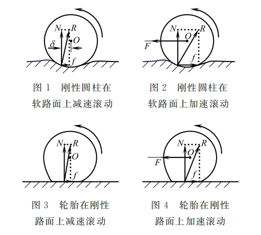 式( 1 )中的力臂 δ 称为滚动摩擦因数,理论上它与接触面的材料、粗糙程度、形变程度、滚动速度等有关[6,7]。但是在速度不很大的情况下,对于给定的圆柱形物体与支撑面, δ 随滚动速度变化很小,可以近似视作一常量[7]。这就是说,当速度不很大时,图 1 与图 2 (或者图 3 与图 4 )中的滚动摩擦力矩 M滚 相等,且与静摩擦力 f 无关。 M滚 总是阻碍着物体的滚动,事实上它也总是在做负功;而静摩擦力 f 则不做功。为了方便计算汽车的平动状况,人们通常把 M滚 对滚动物体的转动所做的负功,等效成一个虚拟的“滚动摩擦力” f 滚对物体的平动做负功[5],即有