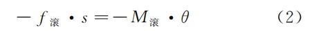 其中, s 是平动的路程, θ 是滚过的角度,f滚 、M滚 各为对应矢量的大小(下文也称“滚动摩擦力”、滚动摩擦力矩,依此类推)。现设圆柱形物体的半径为 r ,并设其与路面接触部分的形变很小,于是则有 s≈rθ ,将式( 1 )代入式( 2 )即得