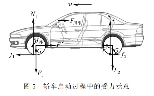 如图 5 所示,设轿车在水平直路面上自静止开始启动,前轮(实际是前两车轮,表述需要,下同)是驱动轮,后轮(实际是后两车轮,同样是表述需要,下同)是从动轮。车轮的受力、前轮的驱动力矩 M驱 ,以及车身受到的空气阻力 F 风阻均已在图中标示出。