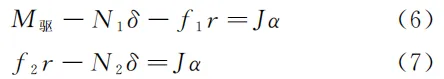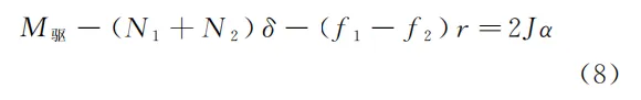 其中, J 为前、后车轮对各自轴心的相同的转动惯量, α 则为共同的角加速度。将式( 6 )与式( 7 )相加便得