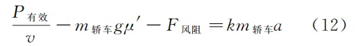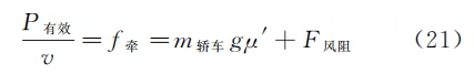 从式( 10 )~式( 12 )不难看出,当 P有效 一定时, P有效/v 就相当于理论上的“牵引力”或驱动力[7],同时也是轿车达到其极限速率 vlim(a=0)时的实际“牵引力” f牵 。当轿车加速时有
