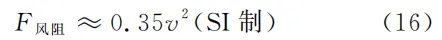 其中, CD是轿车的空气阻力系数,一般可设 CD≈0.30 ;ρ空 是空气密度,在常温( 15℃ )常压( 1atm )下有 ρ空≈1.226kg/m3 ; S 是轿车的迎风投影面积,不妨设为 1.90m2[7] ; v 则是静止空气中的车速。于是, F风阻 的数值表达式可写成