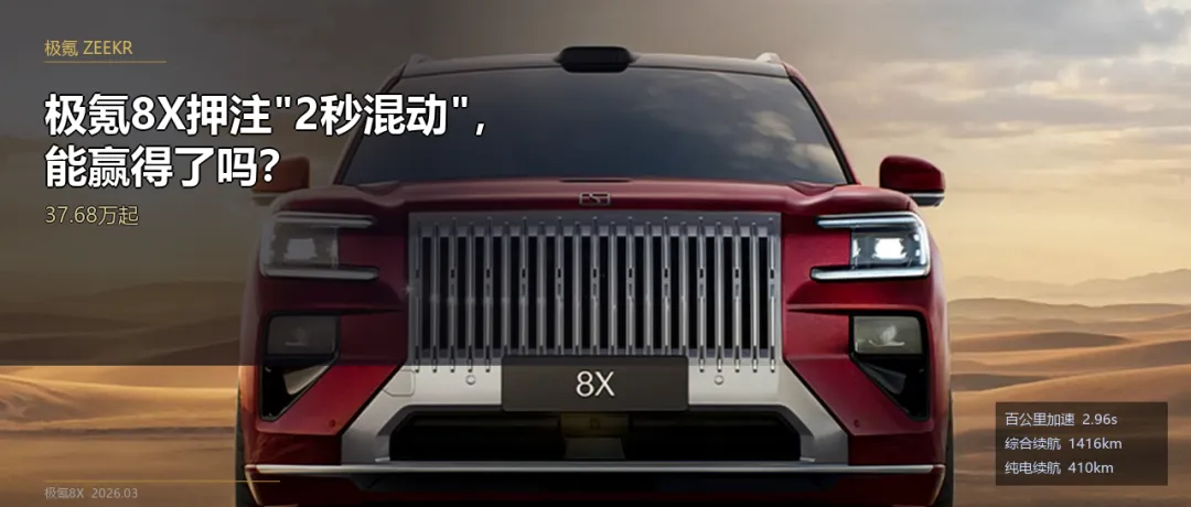 极氪8X是一款技术层面颇具说服力的产品:混动领域的首款"2秒俱乐部"成员、浩瀚-S架构的首个旗舰落地、性能配置全面对标德系高性能SUV。它的出现说明中国品牌在高端混动赛道的技术积累已经到了一个新台阶。