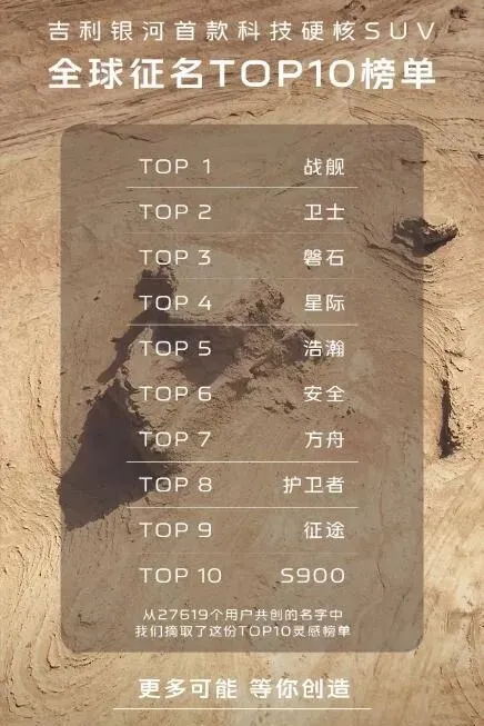 最近刷汽车圈的消息,看到吉利银河搞了个挺有意思的事儿——他们要给自家第一款打着“科技硬核SUV”旗号的大家伙征名,结果前两天把用户贡献的名字里最热门的前十名给晒出来了。这事儿说大不大,但细琢磨还挺有看头,毕竟现在车企都爱整点用户参与的花活,可真把两万多条建议筛出高频词,还排了座次,这阵仗倒是不多见。