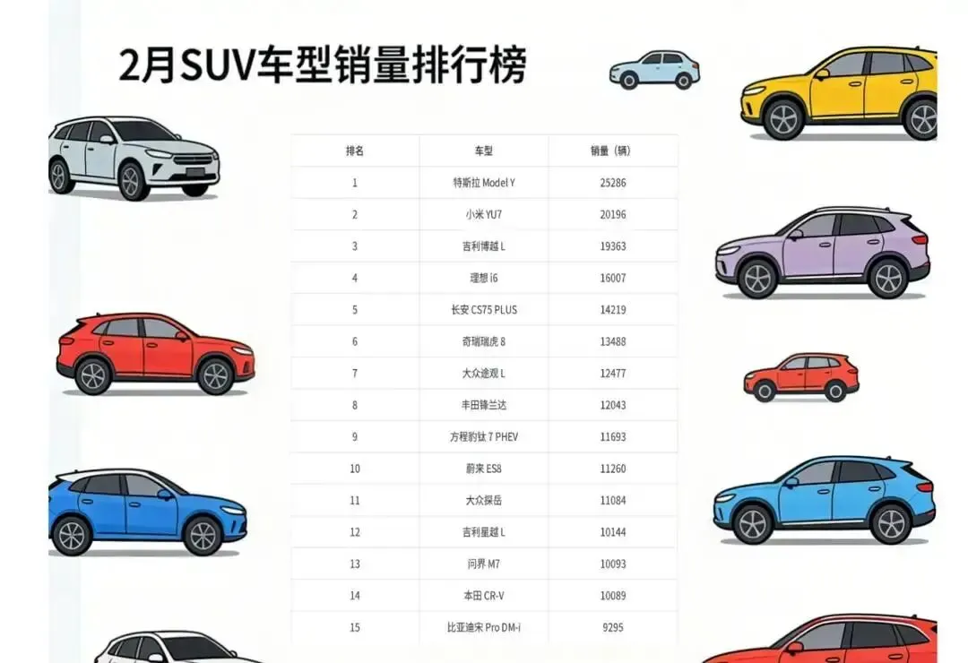 先说个扎心事实:2026年1-2月,国内车市零售257.8万辆,同比跌18.9%。2月单月才103.4万辆,比去年砍了四分之一!按理说,这数据该让车企集体躺平了,可你猜怎么着?在SUV榜单上,燃油车突然集体开挂——2月销量TOP15里,燃油车占了8席,新能源才7席。这哪是“油电对决”?分明是燃油车在寒冬里偷偷逆袭,新能源却在高端战场死磕。