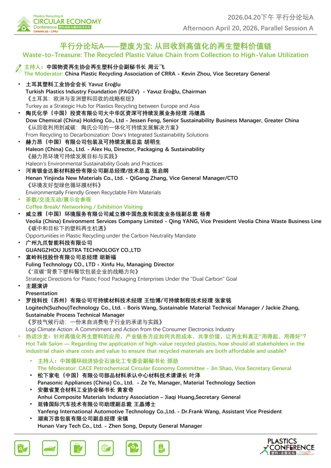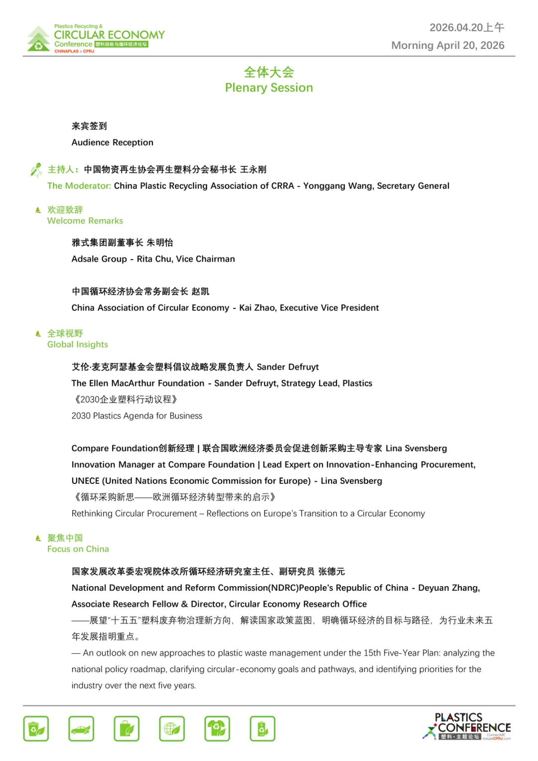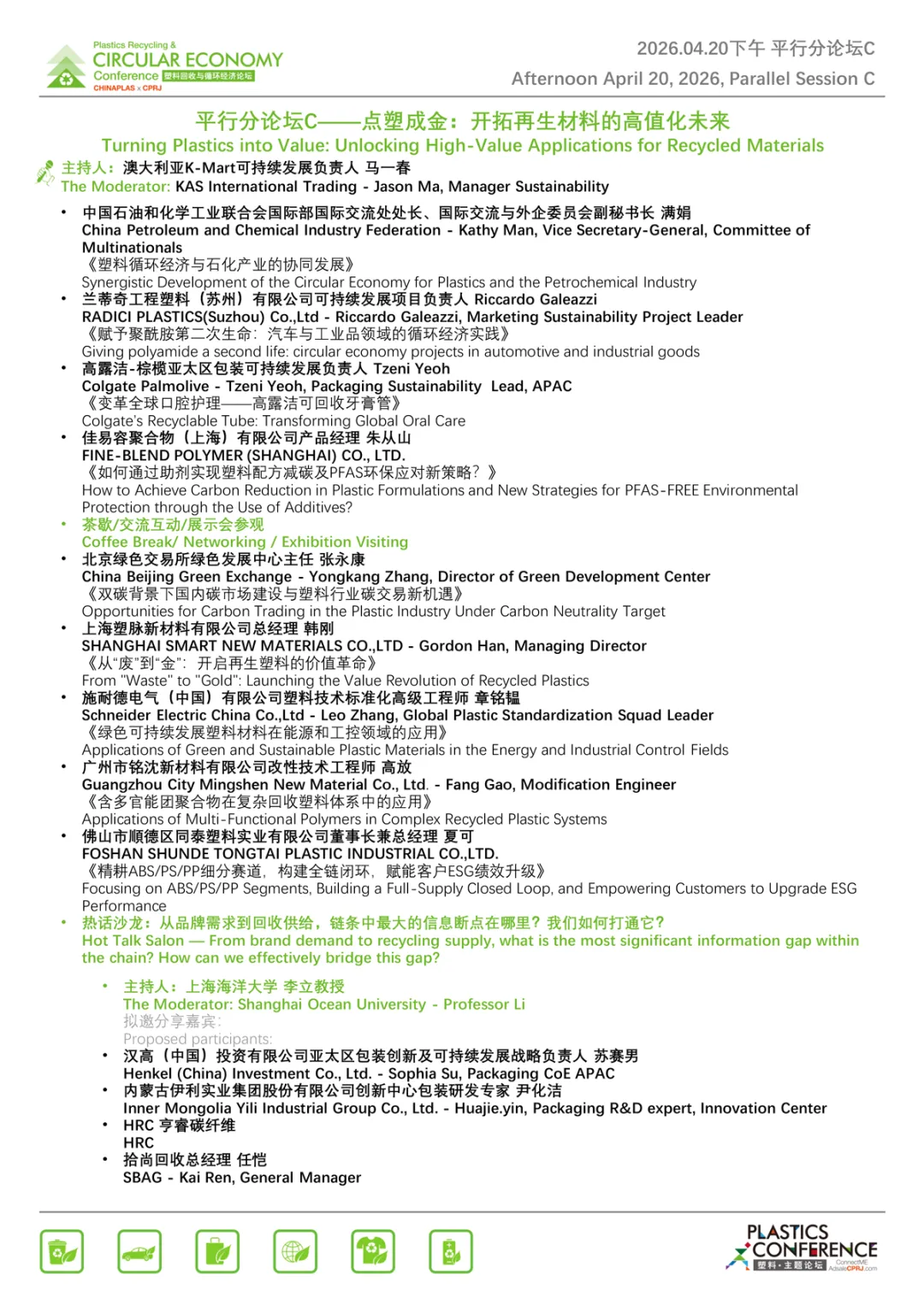 会议形式多样,设置70余场热点话题分享与主题采访,聚焦塑料循环经济中的全球政策走向、低碳消费、全周期绿色供应链体系、再生材料的高值化未来等。