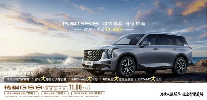 而现在,有国补以旧换新补贴,叠加了厂家13000元置换补贴、15000元限时补贴、再加上金融贴息政策的传祺GS8,实际入手价已经杀入了12万级。用12万多,买到一台车长近5米、轴距2920mm、配2.0T+爱信8AT、拥有中国十佳车身和中保研全G安全评级的中大型豪华SUV——这笔账,怎么算都划算。