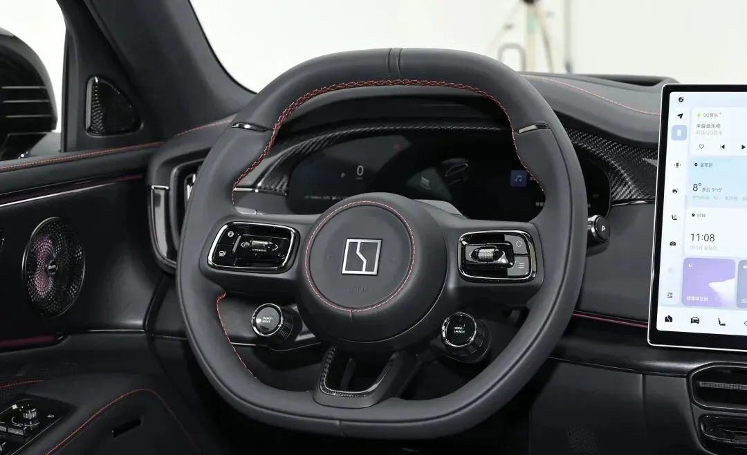 内饰走极繁豪华路线,拒绝极简敷衍。车内空间5.93㎡,二排腿部空间999mm,搭载极氪009同款伊姆斯躺椅,靠背137°可调,腿托90°折叠,搭配Naim 7.1.4.8音响,9.5L冷暖冰箱,17英寸后排屏,豪华感直逼百万级。曜影版专属哑光车漆,22英寸锻造轮毂、黑橙内饰,顶配身份一眼可辨。
