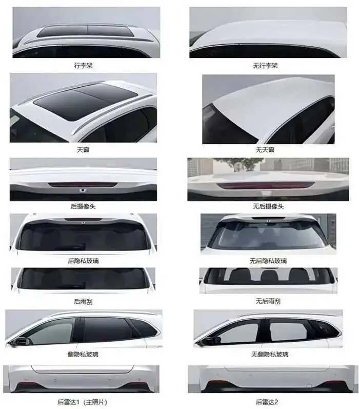 从申报信息看,它的配置选择比较灵活。有的车型有行李架和天窗,有的则没有。在感知硬件上,它目前申报的版本主要搭载了后雷达,没有前侧和后侧雷达,后视摄像头也属于选装。轮毂有三种样式可选。这种配置策略,可能意在控制基础版本的成本。