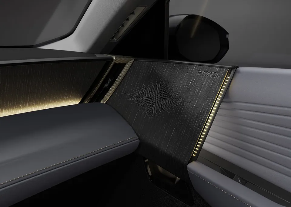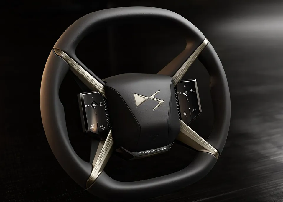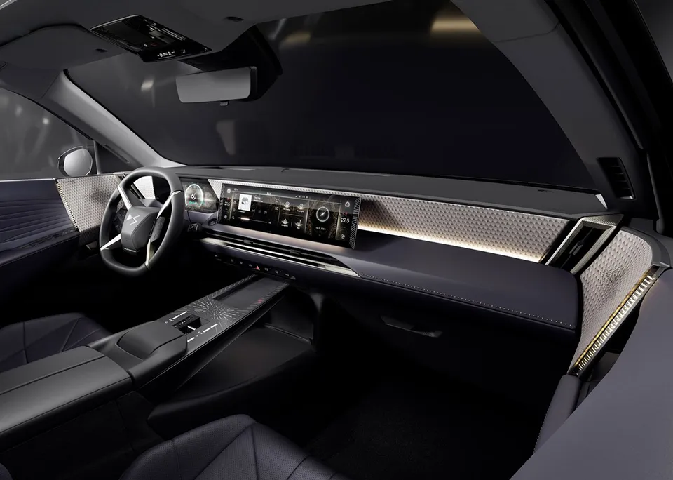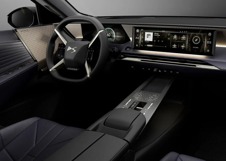 材质的选择依然大胆。五种内饰主题,从玄武岩黑帆布到拜占庭黑Nappa真皮,Alcantara用上了专门调的永恒蓝,Nappa真皮坚持用橄榄叶鞣制。那些"Clous de Paris"巴黎饰钉、珍珠缝线、表带式座椅,都是DS才有的仪式感。