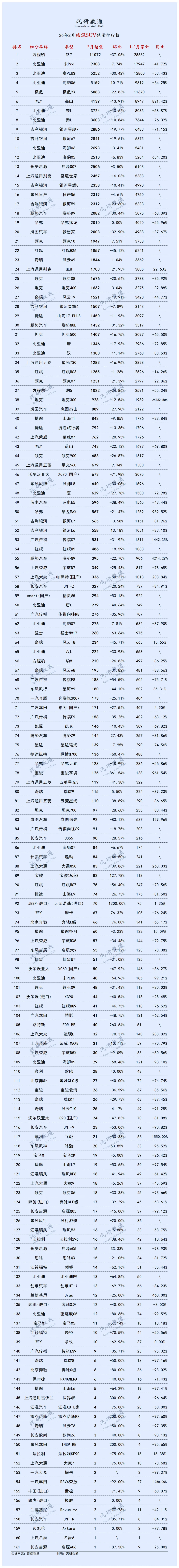 值得关注的是,WEY高山累计同比大涨821.42%,成为榜单中的“黑马”;哈弗枭龙MAX累计同比也增长939.52%,表现亮眼。反观部分热门车型,比亚迪汉、宋PLUS累计同比下滑超80%,表现惨淡。