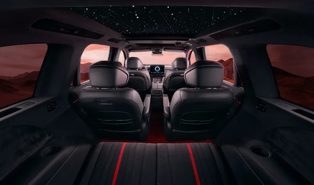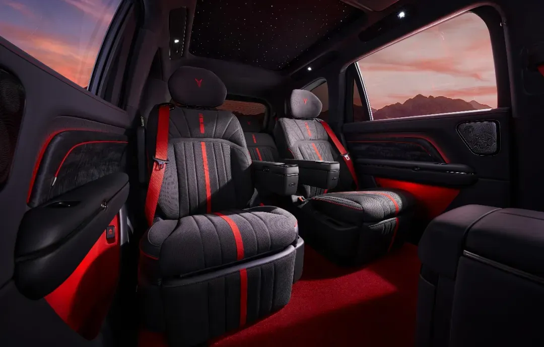 内饰方面,Ultra和黑武士有细节的差别。Ultra的配色、面板材质更强调高端豪华,黑武士则使用碳纤维饰板、流云墨韵饰板等。配置上,两款车型都将配备10.25英寸全液晶仪表盘、55英寸AR-HUD抬头显示以及16.1英寸的悬浮式多媒体触控屏,车机内置鸿蒙座舱5和最新的语音大模型。Ultra版本标配后配21.4英寸的吸顶娱乐屏,黑武士版则配备由598颗灯珠组成的星河天幕星空顶。