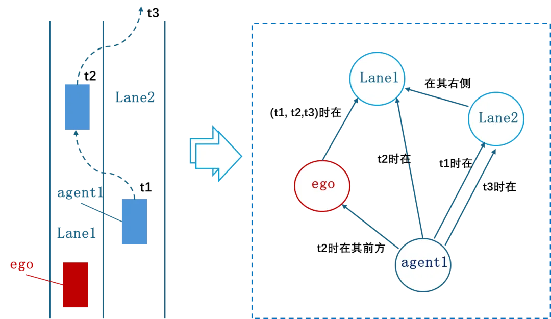 // 100-105帧:他车在左邻车道(obj:Object {id: "obj_123"})-[:IN_LANE { start_frame: 100, end_frame: 105, value: "left_adjacent"}]->(lane_adj:Infra {id: "lane_002", type: "lane"});// 106-120帧:他车切入自车道(cut-in核心关联)(obj:Object {id: "obj_123"})-[:IN_LANE { start_frame: 106, end_frame: 120, value: "self_lane"}]->(lane_self:Infra {id: "lane_001", type: "lane"});示例2:车道间相邻(静态关联,无时序)