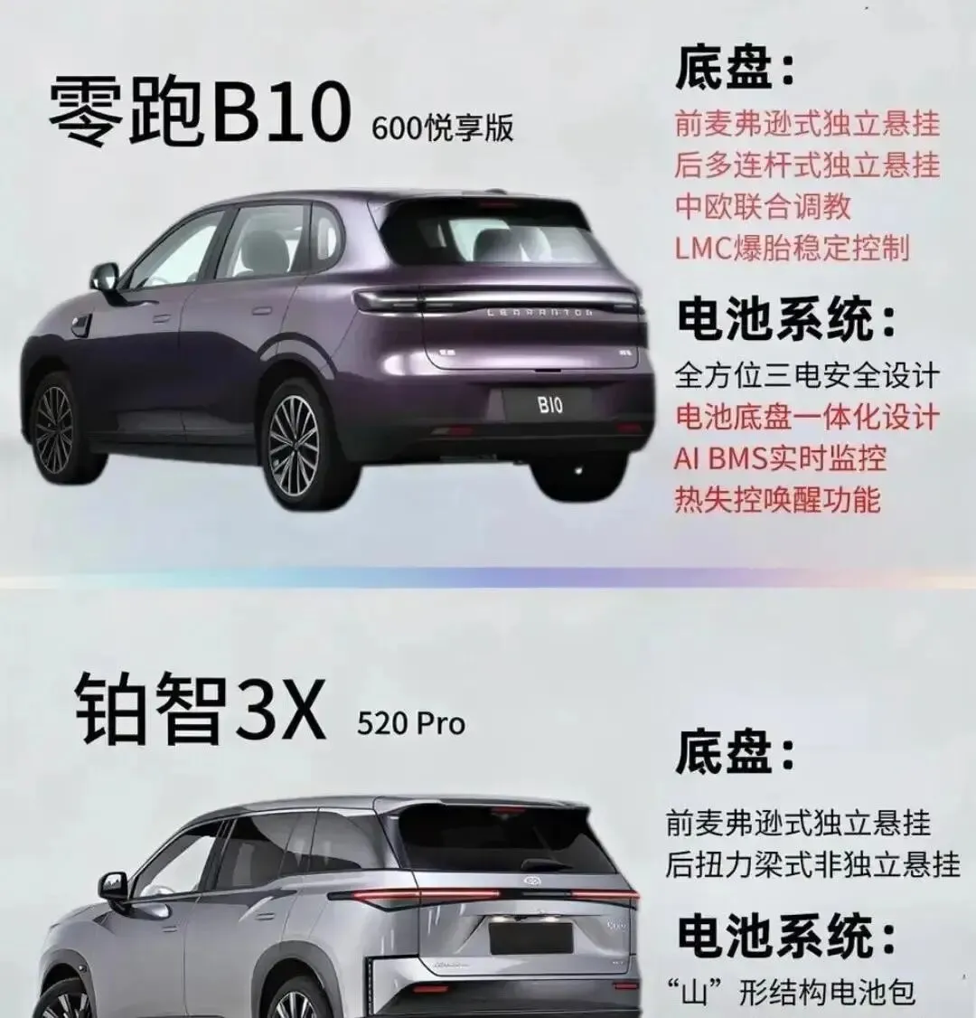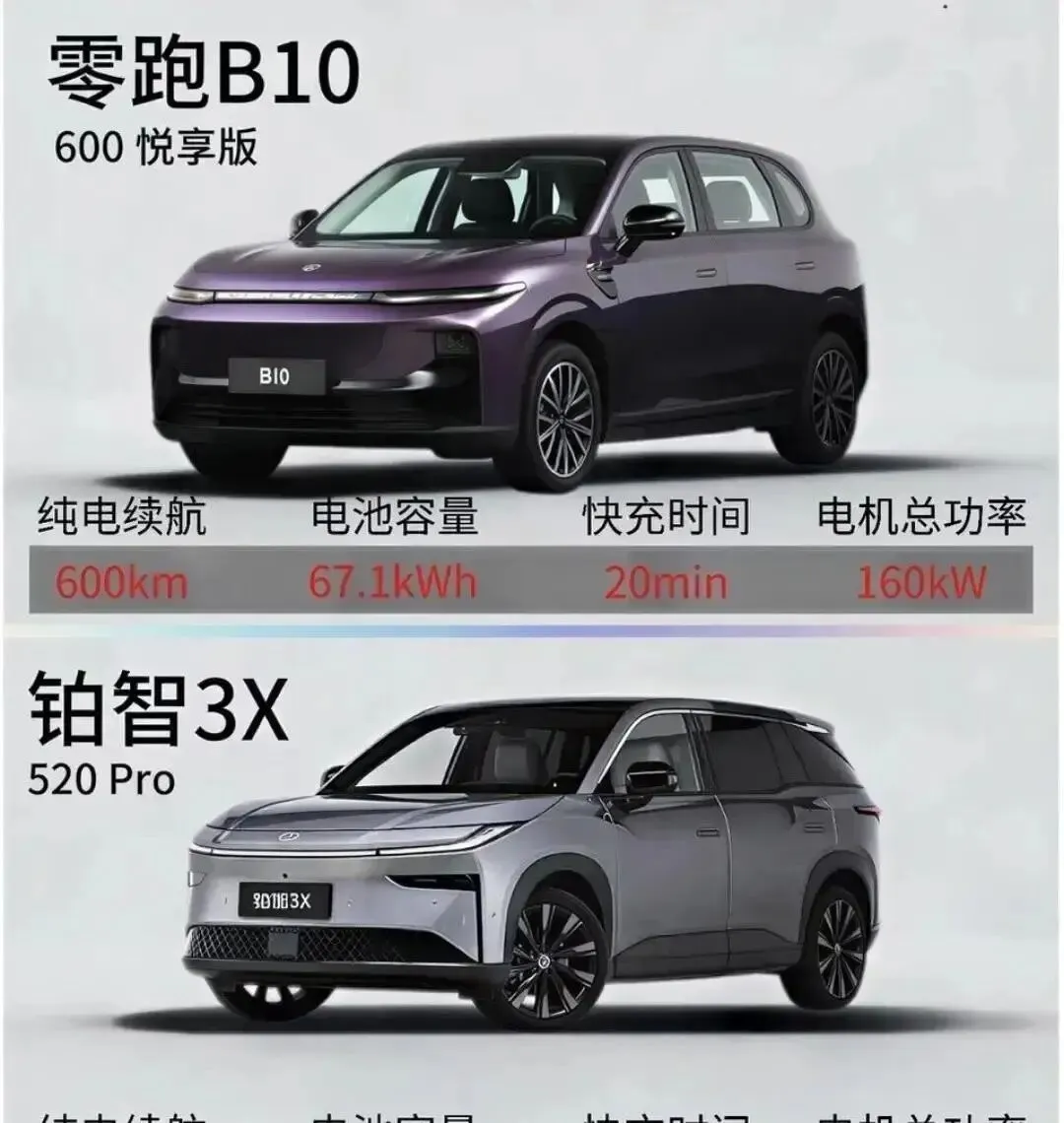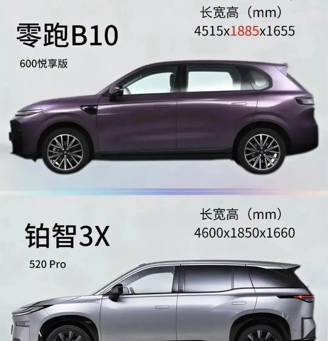 先看空间。铂智3X车长4600毫米,比零跑B10的4515毫米长85毫米,轴距2765毫米也略胜一筹。听着挺唬人吧?可实际坐进去,你才懂什么叫“尺寸是骗人的”。B10车身宽1885毫米,铂智才1850毫米,就这多出的35毫米,后排坐仨人真能喘口气——中间那位肩膀不会蹭到车窗,胳膊能随意搭在窗沿上。铂智呢?轴距长但窄,后排中间位只能当“应急位”,坐久了腰酸背痛。后备箱也一样,B10常规容积480升,铂智450升,开口更规整。搬婴儿车、行李箱时,B10直接“咔哒”塞进去,铂智还得费劲调角度。家庭用户要啥?是“宽”不是“长”,这点没跑。