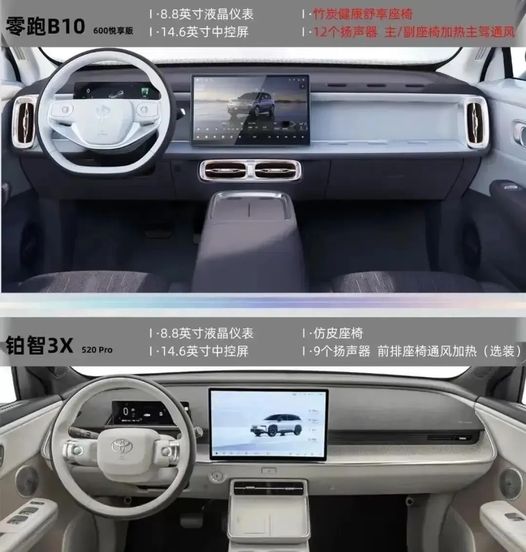 配置上,B10直接“卷”到骨子里。座椅标配竹炭健康材质,加热+通风全都有——夏天不闷汗,冬天不冰屁股。铂智呢?仿皮座椅,加热通风还得加钱选装。这不等于买车时又掏腰包?车机也一样,两者都用8155芯片,但B10的Leapmotor OS系统带双AI大模型(Deepseek+通义千问),能闲聊、查天气、讲段子,还能连续对话。铂智的Toyota Space系统,稳定是稳定,但交互干巴巴的,像在用老年机。