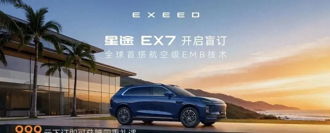 今天早上刷手机看到星途EX7盲订启动,订金999元。没开发布会,也没请一堆明星,就在奇瑞自己办的“电池之夜”上直接亮出实车和参数。我盯着那行小字看了三遍:全球首款量产通过国标EMB法规认证,001号车型。EMB是啥?电子机械制动,不用液压油、不靠刹车片摩擦,靠电机直接夹紧碟片。以前只在空客A350或者某些超跑概念车上听说,现在装进一辆预计售价20万左右的家用SUV里。