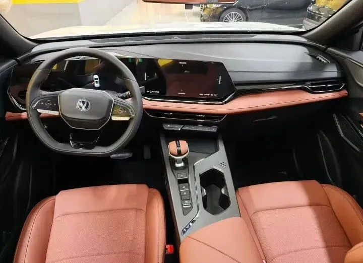 内饰方面,车内采用环抱式座舱设计,用料扎实,大面积软质材质覆盖搭配运动化细节点缀,质感不错。中控配备30英寸环抱式三联屏,包含7英寸全液晶仪表+10.25英寸中控屏+4.2英寸辅助屏,车机系统支持HUAWEI HiCar和Carlink手机互联、语音识别控制、车联网、OTA升级和手机远程控制等功能,中控下方保留了实用的储物空间,高配还配备了带冷热温控的手扶箱,兼顾科技感与实用性。