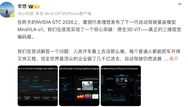 近日,理想汽车基座模型负责人詹锟在NVIDIA GTC 2026 上发布了下一代自动驾驶基础模型 MindVLA-o1。对此,理想汽车 CEO 李想在社交平台发文称,其在底层实现了一个核心突破:原生3D ViT——真正的三维视觉编码器。