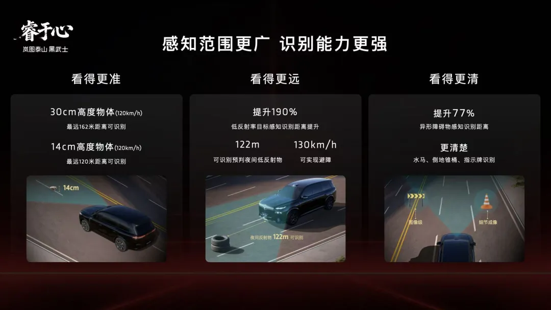 岚图泰山Ultra与黑武士版搭载的896线双光路图像级激光雷达,相比主流的192线雷达实现了断层领先,896线的线数提升了近4倍,针对30cm高度障碍物最远识别距离高达162米,针对14cm小目标也能实现120米远距识别,实现了从“点云级”到“图像级”的跨越,