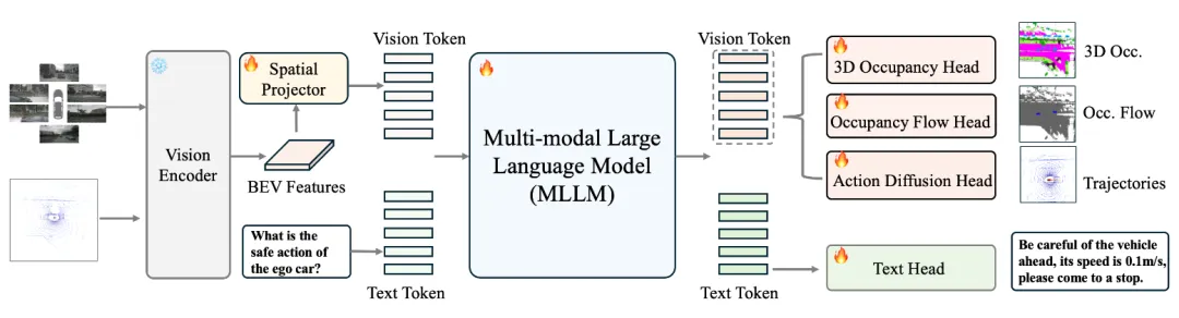 DrivePI的出发点正是打破这一壁垒。研究团队提出了一个统一的空间感知4D多模态大语言模型框架,将LiDAR点云与多视角图像融合后,通过空间投影器转化为视觉token,再输入MLLM进行联合推理。模型的输出端设计了四个专用头:文本头负责场景理解问答,3D占用头输出精确的空间感知结果,占用流头预测动态物体的运动趋势,动作扩散头则生成最终的驾驶轨迹。