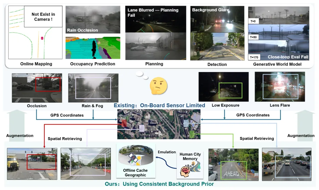 主要内容:一位经验丰富的老司机在大雾天行驶时,即使视线受阻,也能凭借对这条路的记忆判断前方的弯道和路口。这种"空间记忆"能力,正是现有自动驾驶系统所缺乏的。车载传感器只能感知当前时刻的局部环境,在遮挡、极端天气、低曝光等恶劣条件下,感知质量会急剧下降。