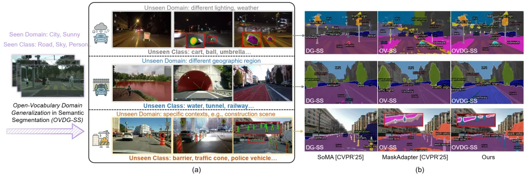 主要内容:语义分割在自动驾驶中扮演着基础性角色,但现有方法面临两类相互独立的局限:域泛化语义分割(DG-SS)能够适应未见域(如从合成数据迁移到真实场景),但只能识别训练时固定的类别集合;开放词汇语义分割(OV-SS)借助CLIP等视觉语言模型可以识别任意类别,但对域偏移极为敏感,在未见域中性能大幅下降。在真实的自动驾驶部署场景中,系统同时面临"未见域"和"未见类别"的双重挑战,现有方法均无法有效应对。