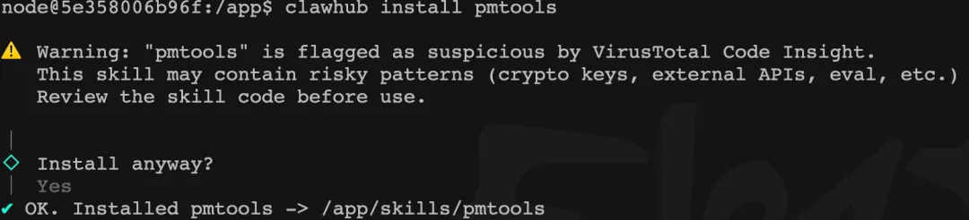 很多极客都在玩 OpenClaw,但大多数人只是把它当聊天机器人。我发现它最近更新了一个插件库,于是顺手敲了一行命令:node@5e358006b96f:/app$ clawhub install pmtools有意思的是,安装时终端弹出了一个巨大的Warning,提示该插件包含外部API和风险模式。我心头一震:这就对了,能直接读写企业数据的工具,没点“侵入性”怎么叫生产力?