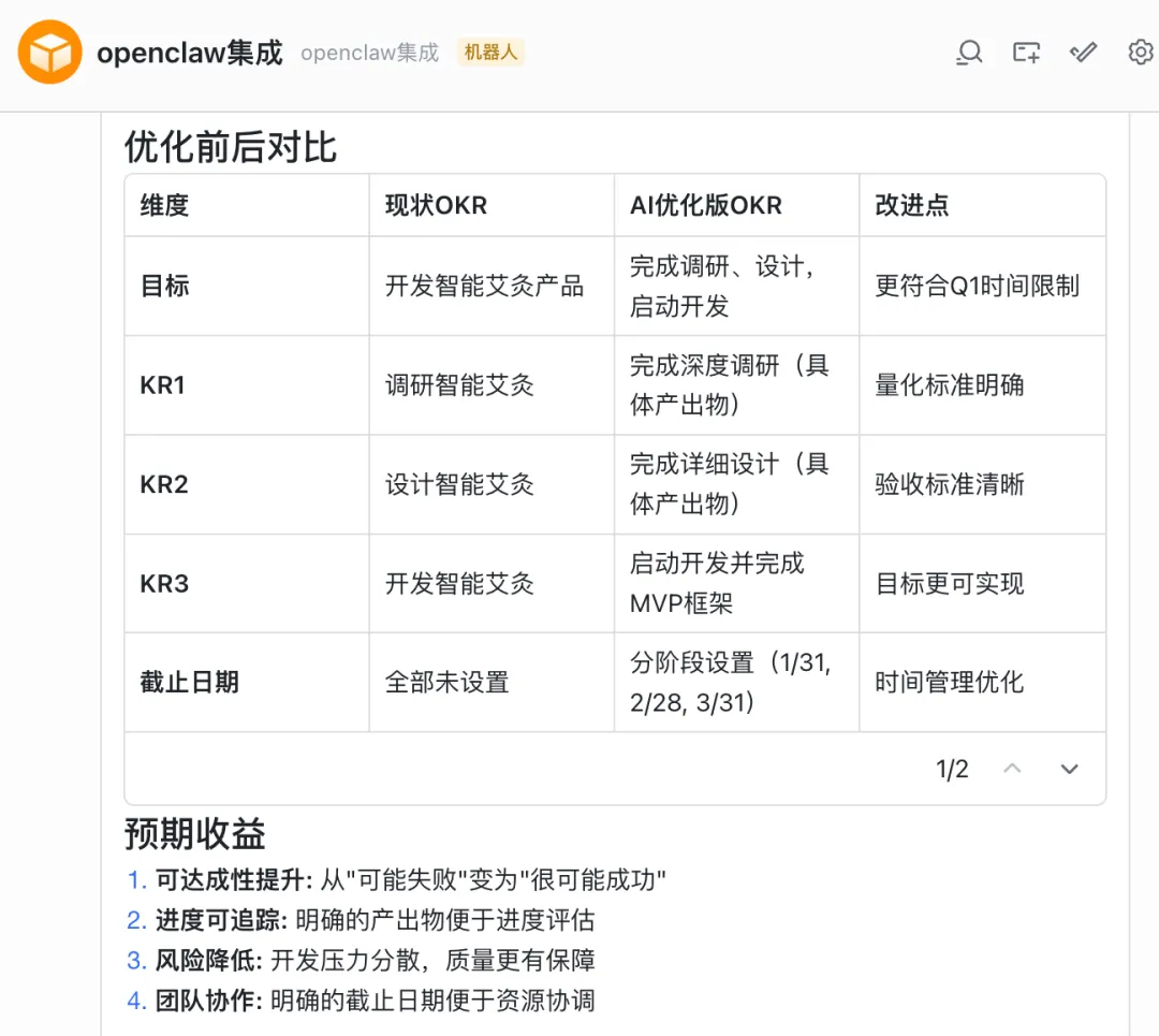 我眼睁睁看着飞书OKR界面里的文字自动闪烁、更替。原本模糊的“设计智能艾灸”,被它精准地重写为:“完成UI/UX设计稿10+页面、产出技术架构图及接口规范。”所有的截止日期(Deadline)被自动补全,从 1/31 到 3/31,逻辑严丝合缝。飞书给我回复了详尽的优化意见并自动更新到飞书OKR系统: