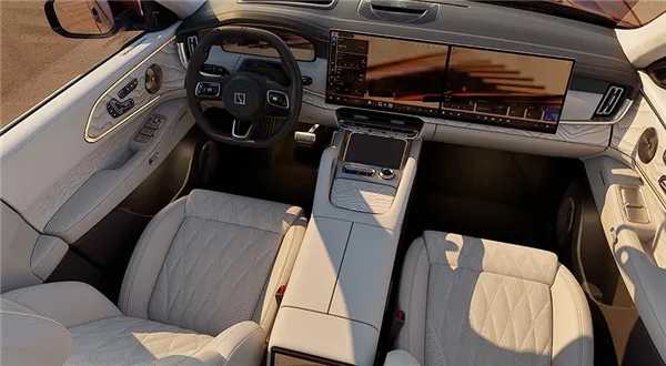 新车车长5000mm,轴距为3030mm,采用5座布局,号称拥有同级别最大的空间尺寸。车内搭载双14.96英寸联屏、10.25英寸液晶仪表、20扬声器音响系统、隐私玻璃、二排折叠桌板、Nappa真皮座椅,副驾座椅提供14向电动调节以及腿托。