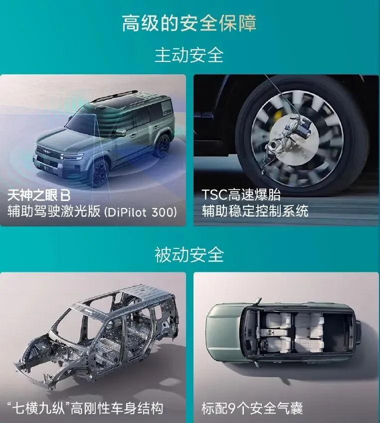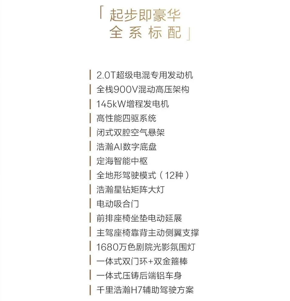 车内配备了15.6英寸中控屏、12.3英寸仪表、26英寸W-HUD、4.5L冷暖冰箱、20扬声器帝瓦雷音响、9个安全气囊等。智能化上搭载天神之眼B-辅助驾驶激光版,含高速和城市领航辅助、全场景泊车辅助等超30项驾驶辅助功能。