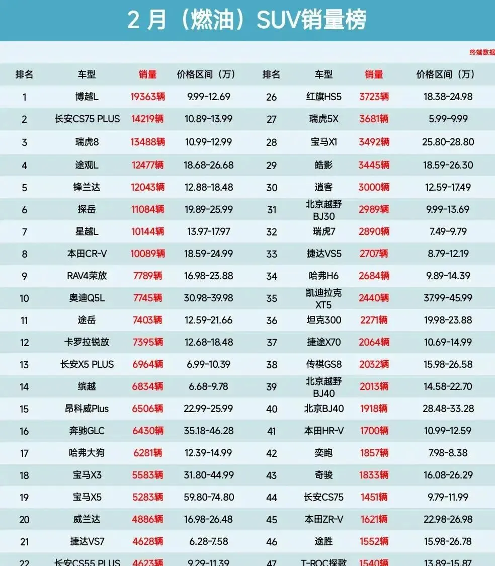 再看榜单其他选手,更扎心。RAV4荣放7789辆排第九,途岳7403辆第十一,卡罗拉锐放7395辆第十二。合资车卖得比国产车还难,奔驰GLC才6430辆,宝马X55283辆——这销量,连博越L的零头都不到。20名开外更是惨烈,汉兰达、红旗HS5、皓影都没破4500辆。红旗HS5才3723辆,宝马X13492辆,北京越野BJ302989辆。哈弗H6、坦克300销量垫底,老司机都摇头。