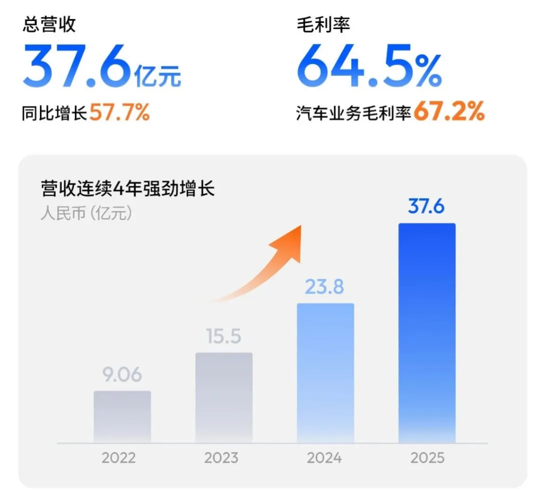 2025年地平线公司总营收37.6 亿元,同比+57.7%,连续 4 年保持高增长。整体业务毛利率64.5%,其中汽车业务67.2%,盈利质量稳定。从业务结构来看,产品解决方案16.22 亿元(+144.2%),授权及服务19.35 亿元(+17.4%),产品业务占比升至51.5%,均衡性不断增强。