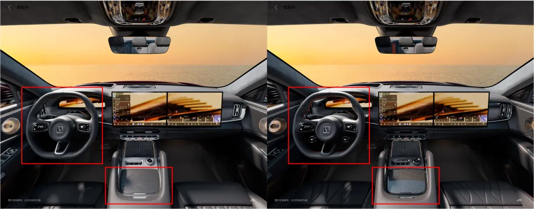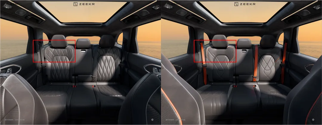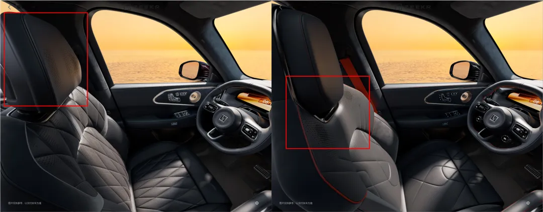 内饰的运动化氛围的体现还挺多的,运动座椅、红色缝线、碳纤维面板,方向盘上还增加了boost按键。目测这个运动座椅的舒适度可能还不错,坐垫靠背都比较厚实之外,腿托等等功能也没有减少。甚至普通版本上的头枕音响可能也保留了,布置在肩部两侧。后排座椅差异更小。