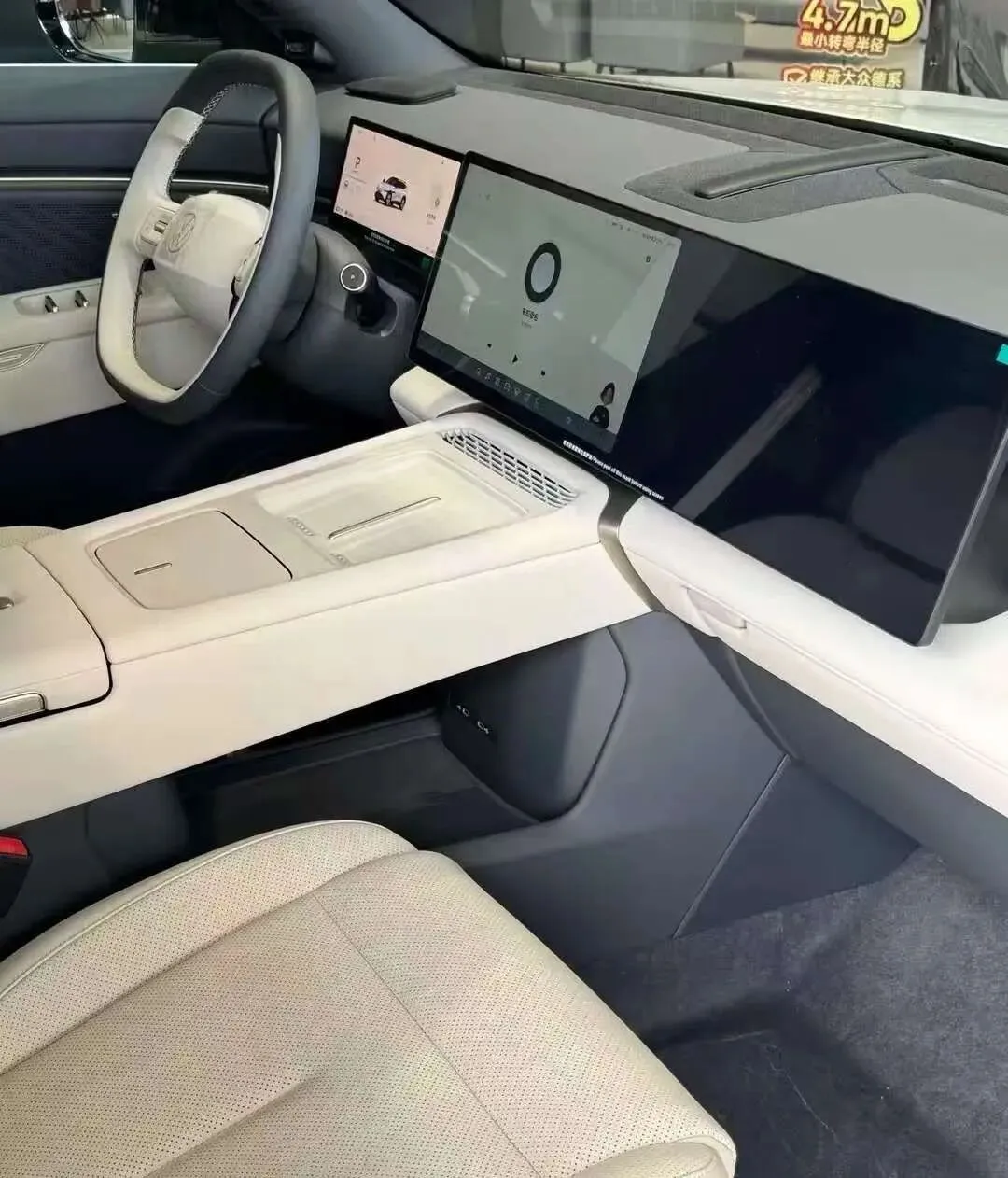 座舱用8295芯片,两个14.96英寸大屏,副驾还有个娱乐屏。语音能听懂“把副驾调低一点再开按摩”,不是只能答“好的”。扶手箱里有冰箱,俩手机放上去,50W无线充同时跑,带娃出门路上冰水、奶瓶、平板全安排明白。