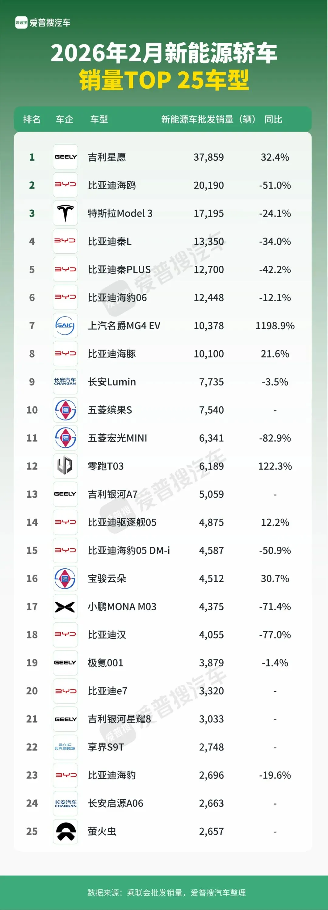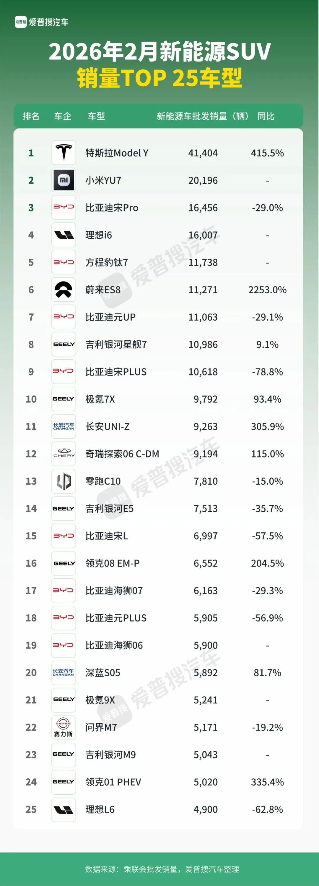 格局突变!2月SUV销量榜:仅2款破2万,小米YU7第2,方程豹钛7第9