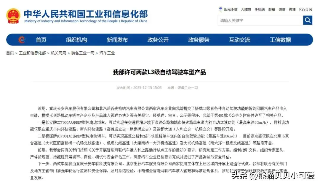 在2025年仅剩两周时间之际,工信部在官网发布消息称,许可两款L3级自动驾驶车型产品,一款为长安牌SC7000AAARBEV型纯电动轿车;