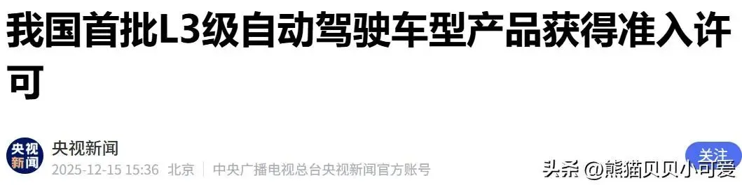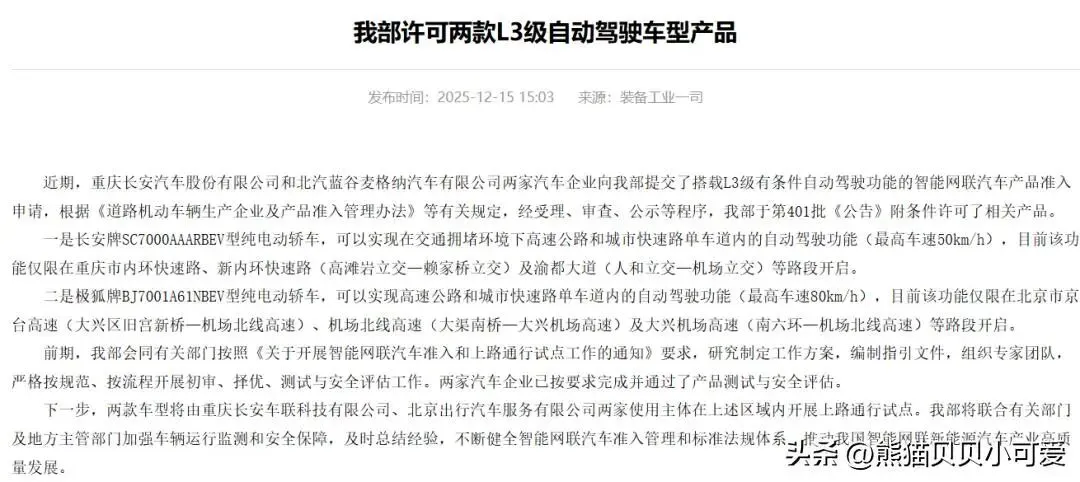 12月15日,工业和信息化部正式宣布许可两款L3级有条件自动驾驶车型产品上市,标志着我国自动驾驶技术从测试验证迈向商业化应用的关键一步。