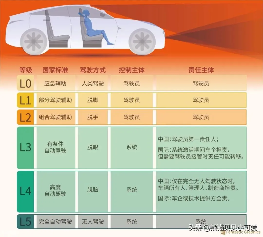 根据工业和信息化部发布的《汽车驾驶自动化分级》标准,L3级自动驾驶与目前广泛应用的L2级辅助驾驶有很大区别。L2级辅助驾驶仅能实现部分功能的自动化,驾驶员仍需时刻保持警惕;而L3级在特定条件下可以完全解放驾驶员的双手和双脚。根据我国2022年3月1日起实施的《汽车驾驶自动化分级》国家推荐标准,自动驾驶分为L0到L5六个等级: