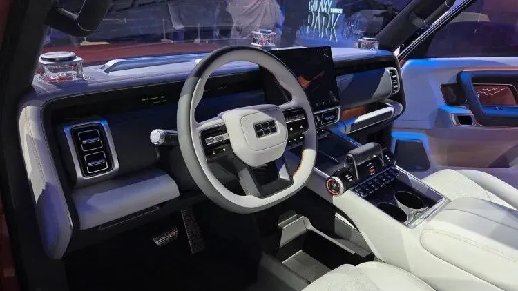当然,这车最值得聊的还是它的“硬货”。官方透露,银河战舰700搭载了自研的GVMC动态控制系统,宣称麋鹿测试能达到80km/h——这对于一台带大梁的硬派SUV来说,数据相当离谱,实际表现得等试驾再看。另外,它配了AI智能四驱,支持前驱、后驱、四驱自动切换,还有蟹行模式、原地掉头和爆胎行驶控制。涉水深度800mm,并且支持卫星通信,去无人区也不怕失联。车顶那个激光雷达也预示着高阶智驾不会缺席。