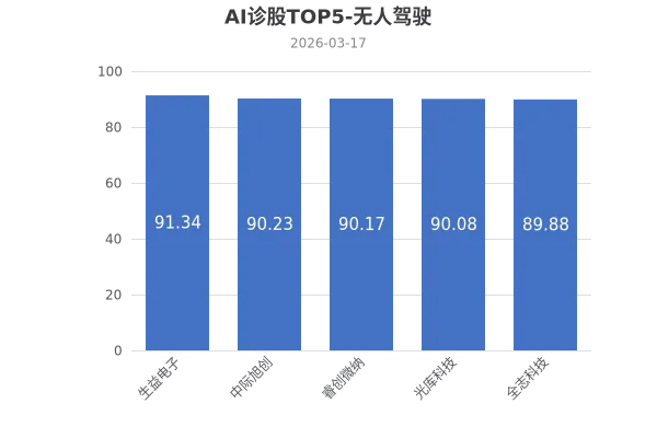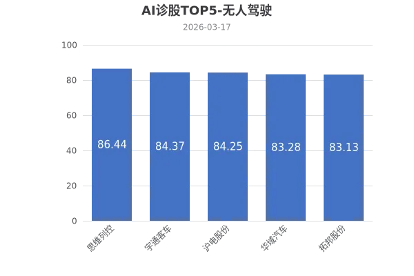 本部分通过AI对无人驾驶概念内的266只股票进行多维度分析,其中AI诊股综合得分最高的5家公司为:思维列控、宇通客车、沪电股份、华域汽车、拓邦股份。