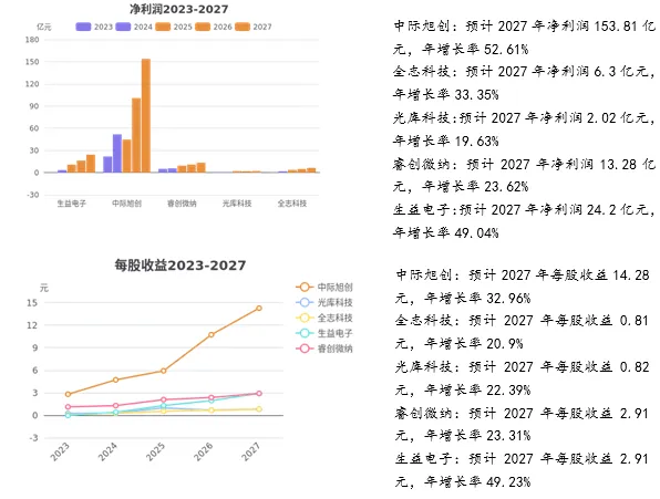 净利润增长率是指企业当期净利润比上期净利润的增长幅度,指标值越大代表企业盈利增长能力越强。本期净利润增长率排序(由高到低):生益电子、中际旭创、全志科技、光库科技、睿创微纳。