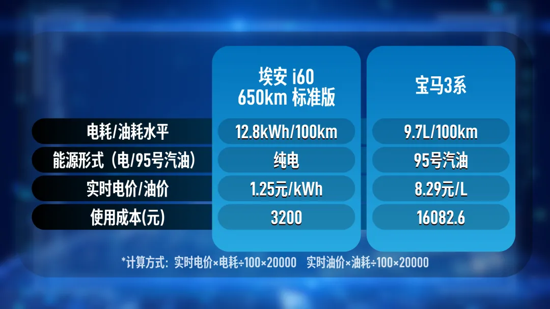 我们不妨直击关键,先来算笔账!以我们这次拿到的埃安i60 650km进阶版为例,它搭载的是一块同级领先的75kWh大电池,纯电续航650km。我同事开的是需要加95号汽油的宝马3系,以一年要开2万公里来计算,如果开的是埃安i60 650km进阶版光是在能耗成本上就省了一大截。需要特别说明的是,埃安i60还是以标准电耗计算,实际使用中用车成本会比测算结果更低!而在维护成本方面纯电车型更有优势,再结合保养和维护等全周期用车成本,3年能省出5万多!